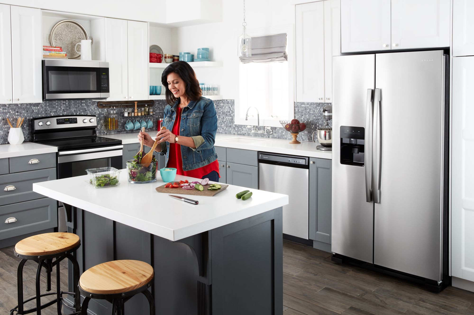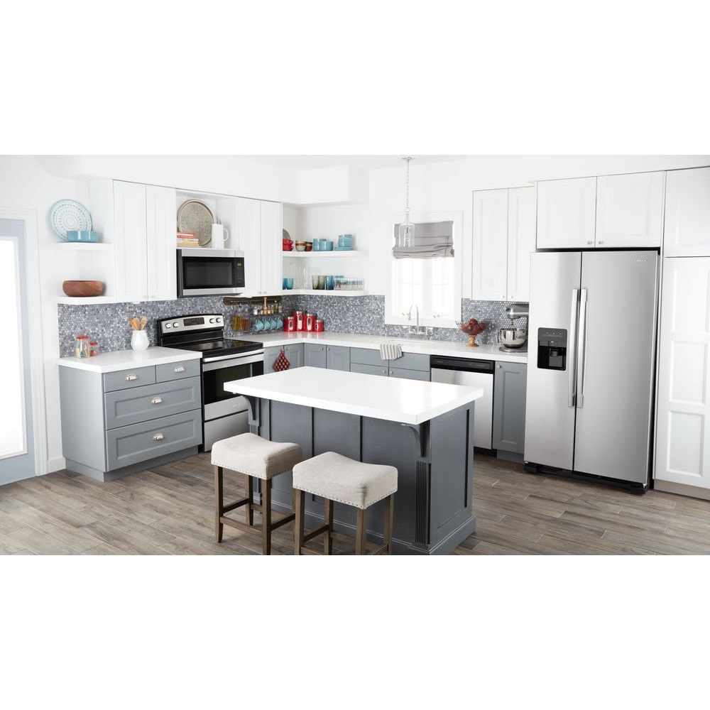 Our 33-inch Amana® Side-by-Side Refrigerator is great for smaller spaces, giving you the right amount of storage room. This 21 Cu. Ft. refrigerator with ice and water dispenser lets you grab fresh H2O with a Dual Pad Dispenser with EveryDrop™ Water Filter. Easily set temps with Electronic Temperature Controls. And big items fit in the Gallon Door Storage Bins.