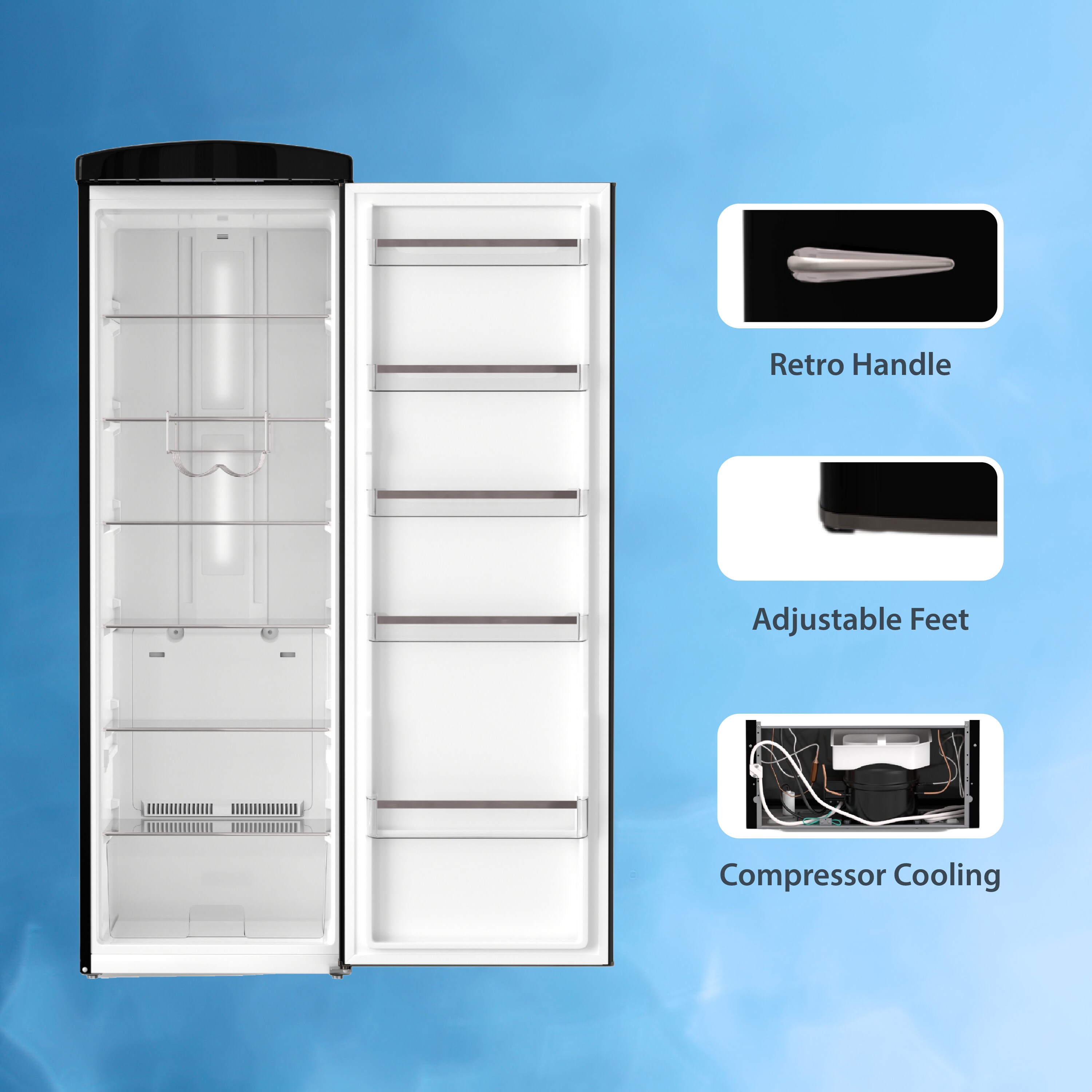 Looking to make a retro bold statement in your home? Well, look no further. This 50’s style full-size refrigerator is a beauty that’ll never go out of style. Modern in energy and space efficiency but wrapped in Classic retro style, this refrigerator is a true blend of midcentury cool design with modern innovation. Not only does this one-door retro refrigerator offer generous storage at 11.12 Cu. ft. capacity. But, with 5 bottle-friendly door racks, 5 glass shelves plus a bottom shelf, it gives you the option to organize your food items as you wish. Featuring interior light, easy to reach adjustable controls, and rust proof handle, this gorgeous slimline fridge adds character to any space in a way that a normal refrigerator just doesn’t