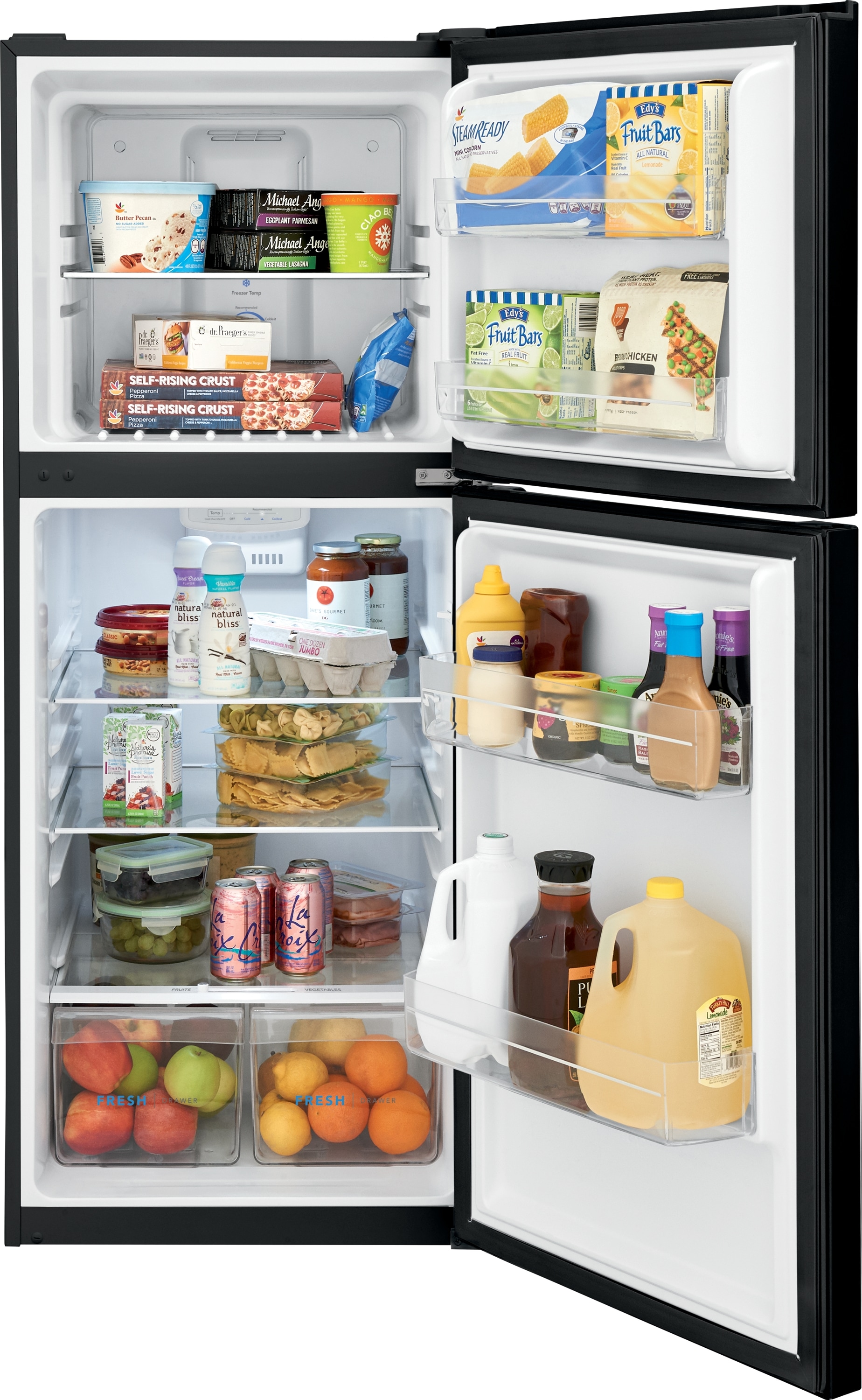 The Frigidaire 10.1 cu. Ft. apartment-size top freezer refrigerator has adjustable shelving and humidity control crisper drawers for storing fruits and vegetables. It is also equipped with bright lighting to keep contents clearly visible. E-star certification saves on energy costs and reversible doors and rear rollers accommodate your installation needs.