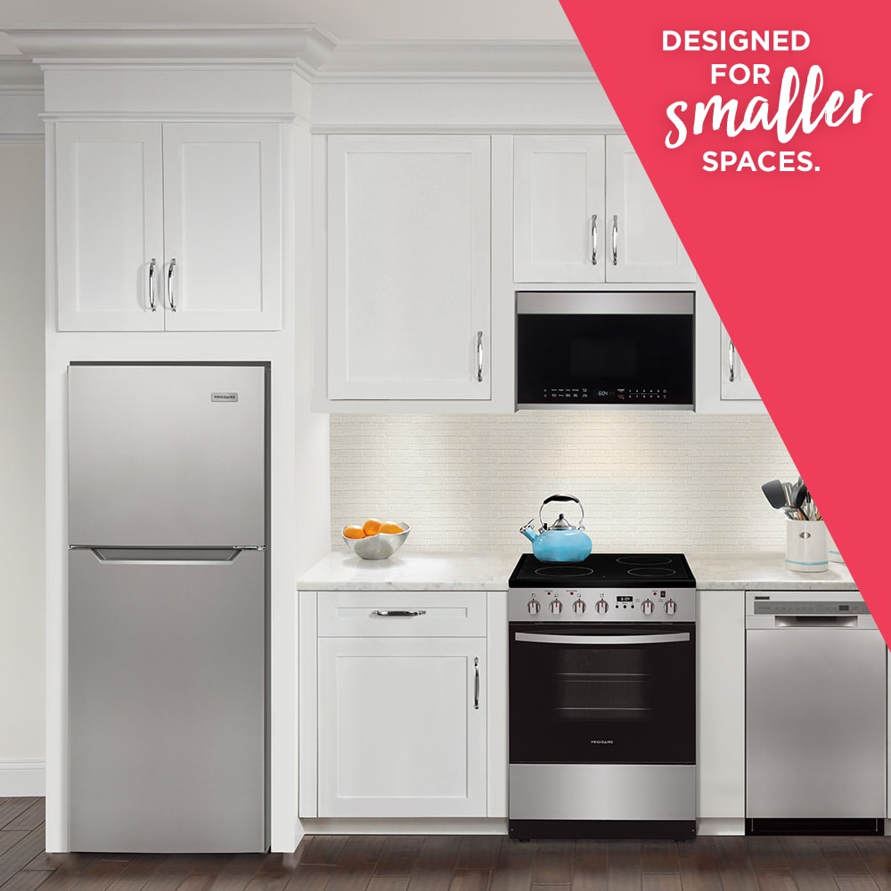 The Frigidaire 10.1 cu. Ft. apartment-size top freezer refrigerator has adjustable shelving and humidity control crisper drawers for storing fruits and vegetables. It is also equipped with bright lighting to keep contents clearly visible. E-star certification saves on energy costs and reversible doors and rear rollers accommodate your installation needs.