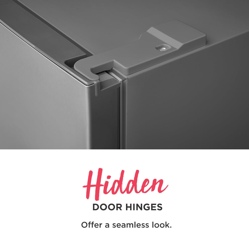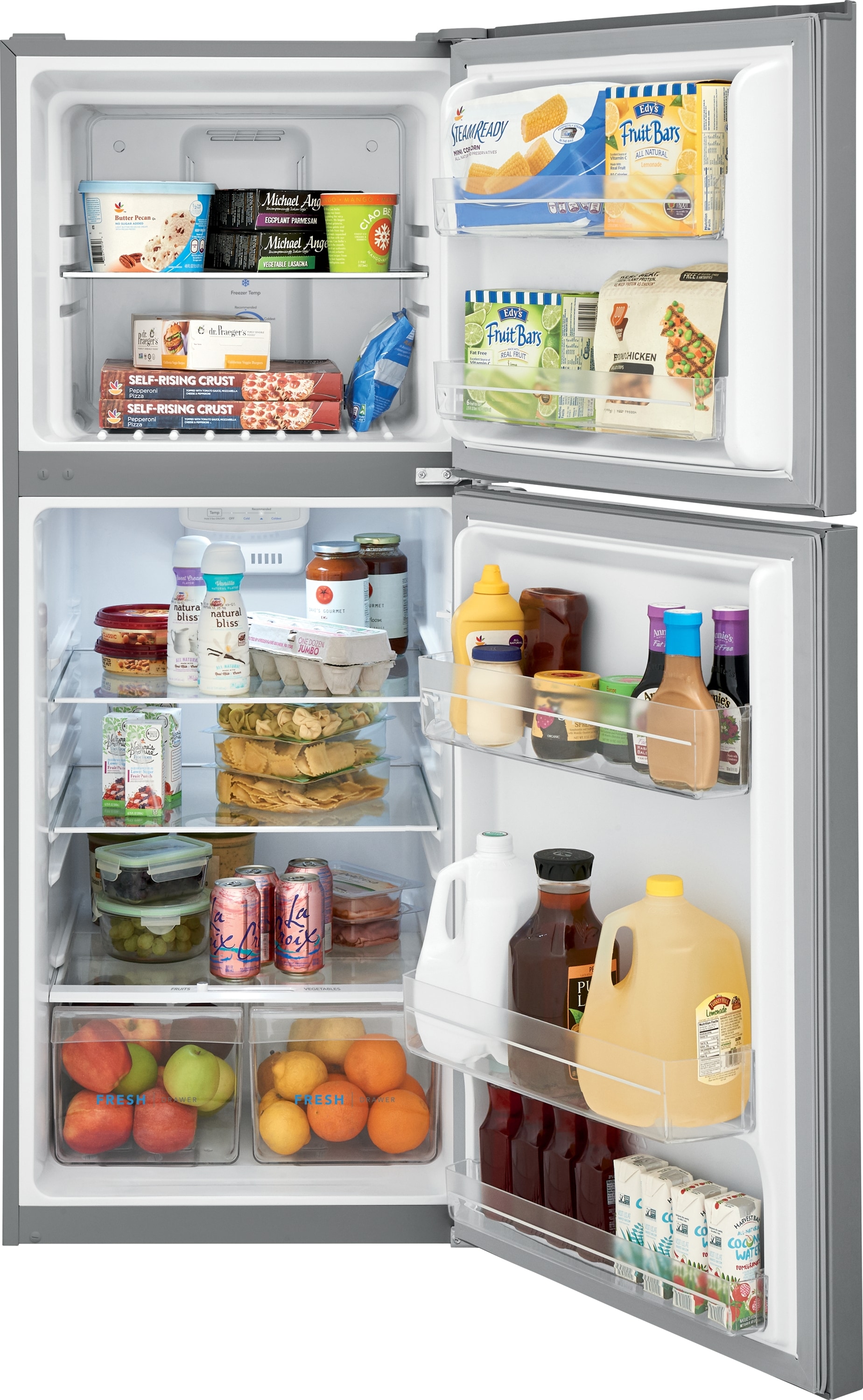 The Frigidaire 11.6 cu. Ft. apartment-size top freezer refrigerator has adjustable shelving and humidity control crisper drawers for storing fruits and vegetables. It is also equipped with bright lighting to keep contents clearly visible. E-star certification saves on energy costs and reversible doors and rear rollers accommodate your installation needs.