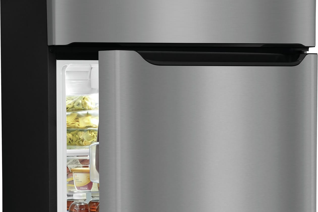 The Frigidaire 20 cubic foot top freezer refrigerator fits in the same sized cutout as a traditional 18 cu. ft. model. This refrigerator features the EvenTemp™ Cooling System, precise temperature control which keeps food at one ideal temperature. Spacious interior storage options include a full-width deli drawer, generous door bins, and a full-width glass freezer shelf.