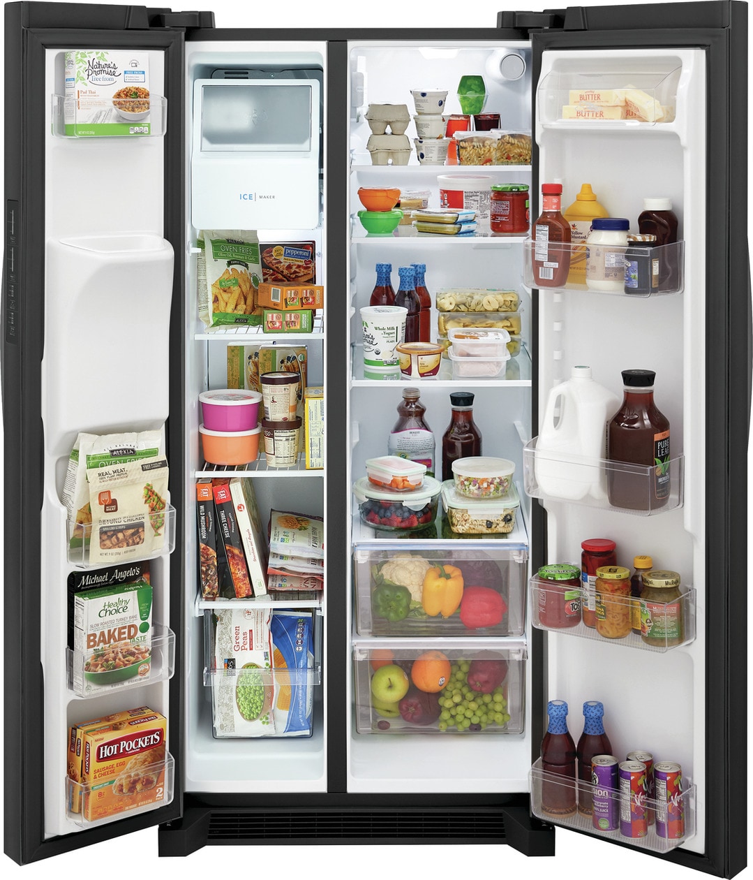 This Frigidaire 33-in side-by-side refrigerator offers our EvenTemp™ Cooling System which reacts quickly to temperature fluctuations and constantly circulates cold air throughout the fresh food and freezer compartments, ensuring a consistent cool from top to bottom. Keep fruits and vegetables fresh in our crispers that offer a seal to block out dry air. Find fresh foods quickly with our bright LED lighting.