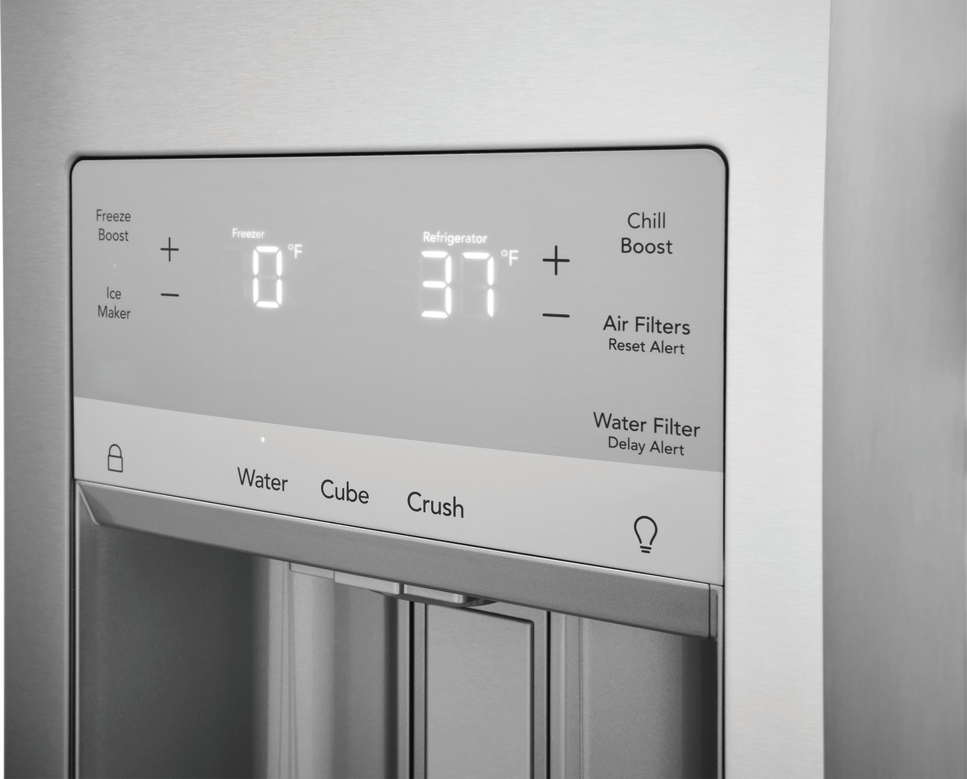 This Frigidaire Gallery French door refrigerator maintains the taste and texture of even your most delicate foods. Lettuce and broccoli stay fresh and crisp for longer in our exclusive CrispSeal® fresh crispers than in any comparable crispers. Our 3 advanced technologies block out dry air, automatically optimize humidity while removing excess moisture, and our built-in antioxidant filter reduces ethylene gas, odors and preserves produce color. Get more storage out of your refrigerator with clever organization solutions that maximize usable space, including in-door condiment storage, a slide-under shelf, a snack zone, a flexible bin which can be used as crisper or an open compartment, and accessory railing system which works with our optional storage pan and wine rack. Get extra space for all your most used items with the custom-flex temp drawer. Store yogurt, beer, or even frozen pizzas with the middle drawer that can be a refrigerator or a freezer. Awarded Editor’s Choice French Door Refrigerator of 2023 by Reviewed.com (USA Today).