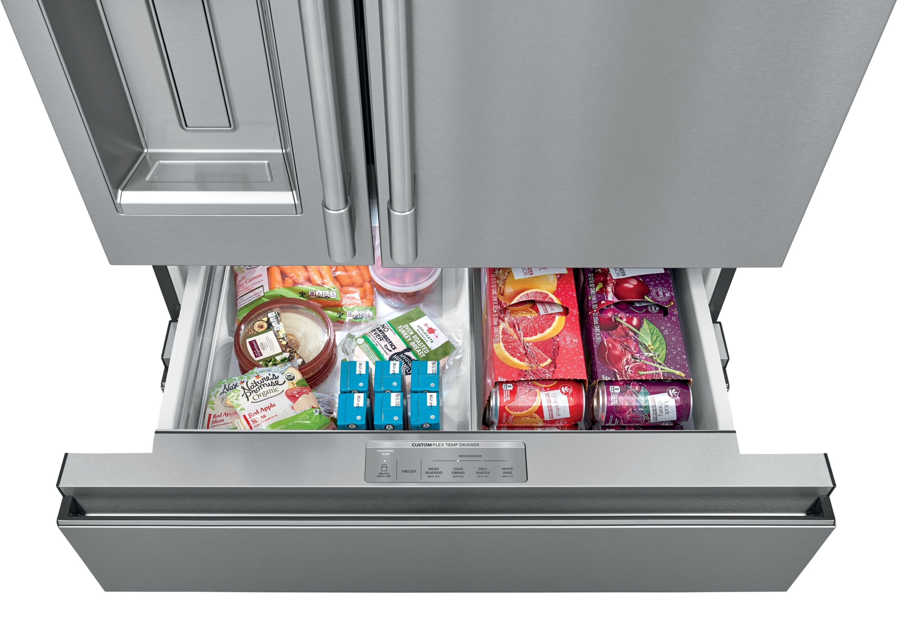 CustomStore yogurt, beer, or frozen pizzas with the middle convertible drawer that can be a refrigerator or a freezer.