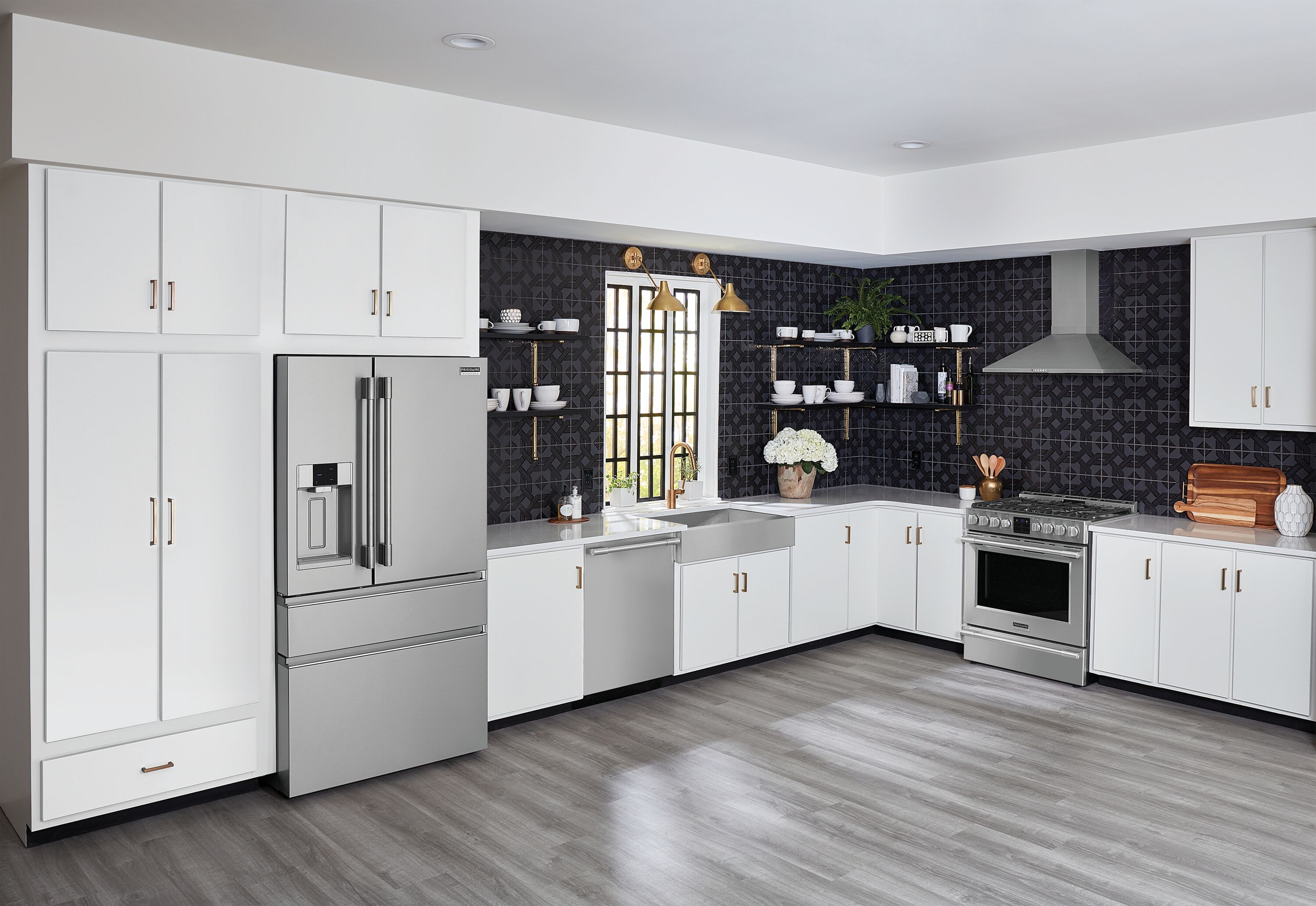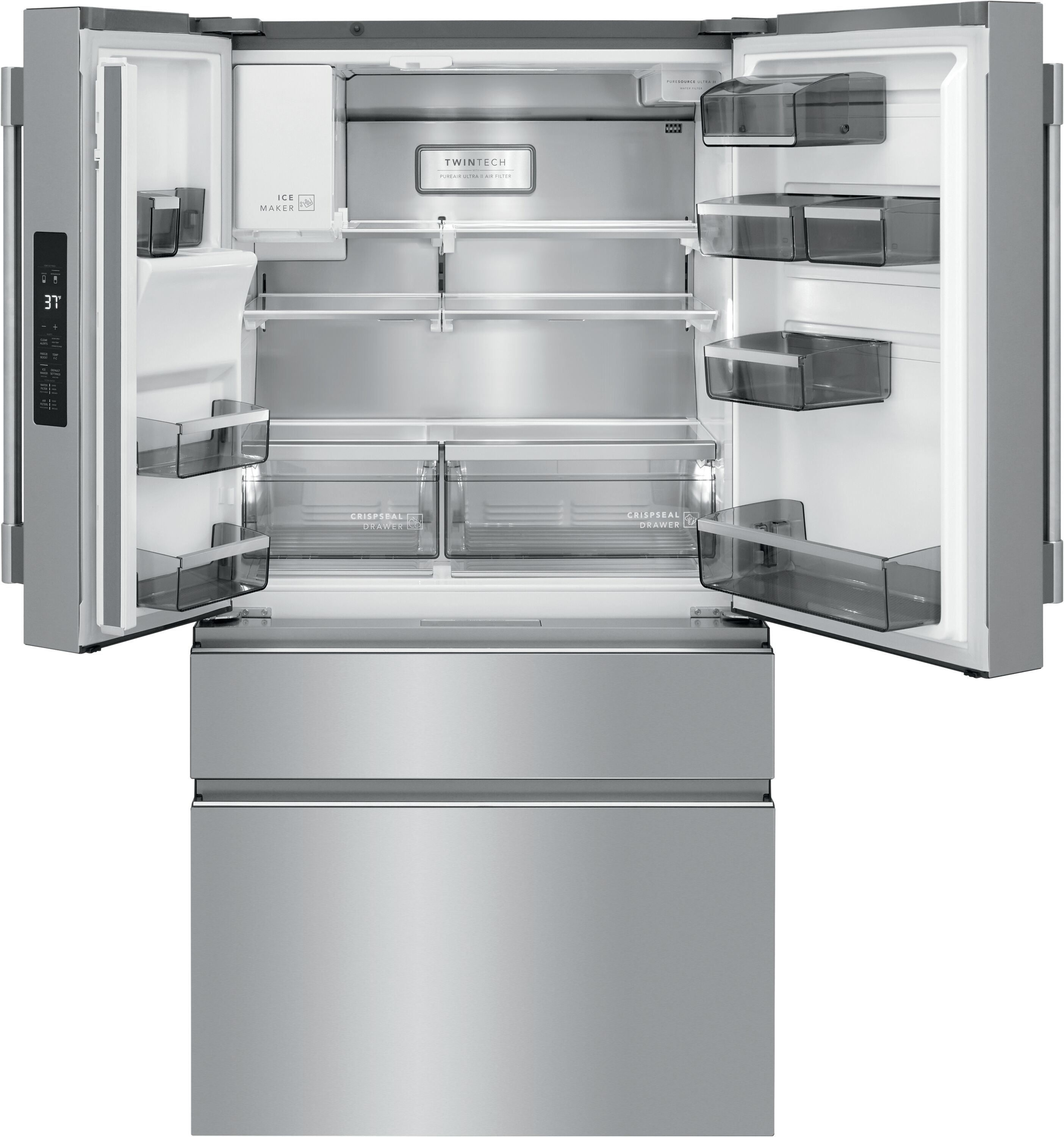 This Frigidaire four-door French door refrigerator offers the Custom-Flex® Temp Drawer, the only drawer available that fully switches from frig to freezer, so you can store all your family favorites from yogurt to frozen pizza. It helps keep fruits and vegetables fresh longer with CrispSeal® crispers, and it’s easy to organize and clean with SpaceWise® organization system and Smudge-Proof® stainless steel.