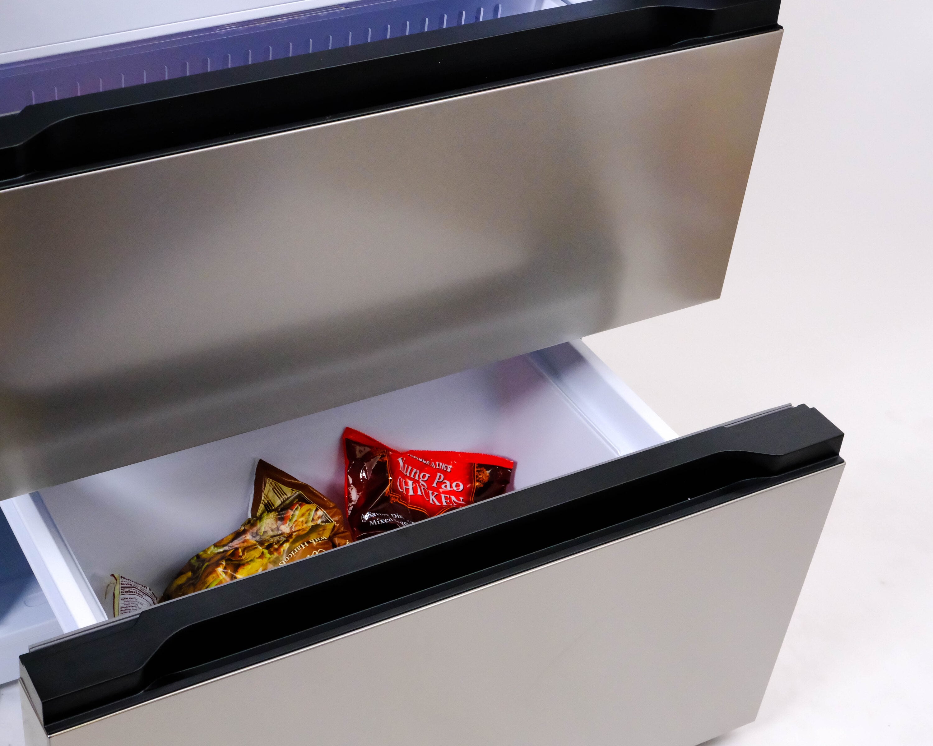 Bottom freezer drawers glides out smoothly exposing a massive freezer compartment