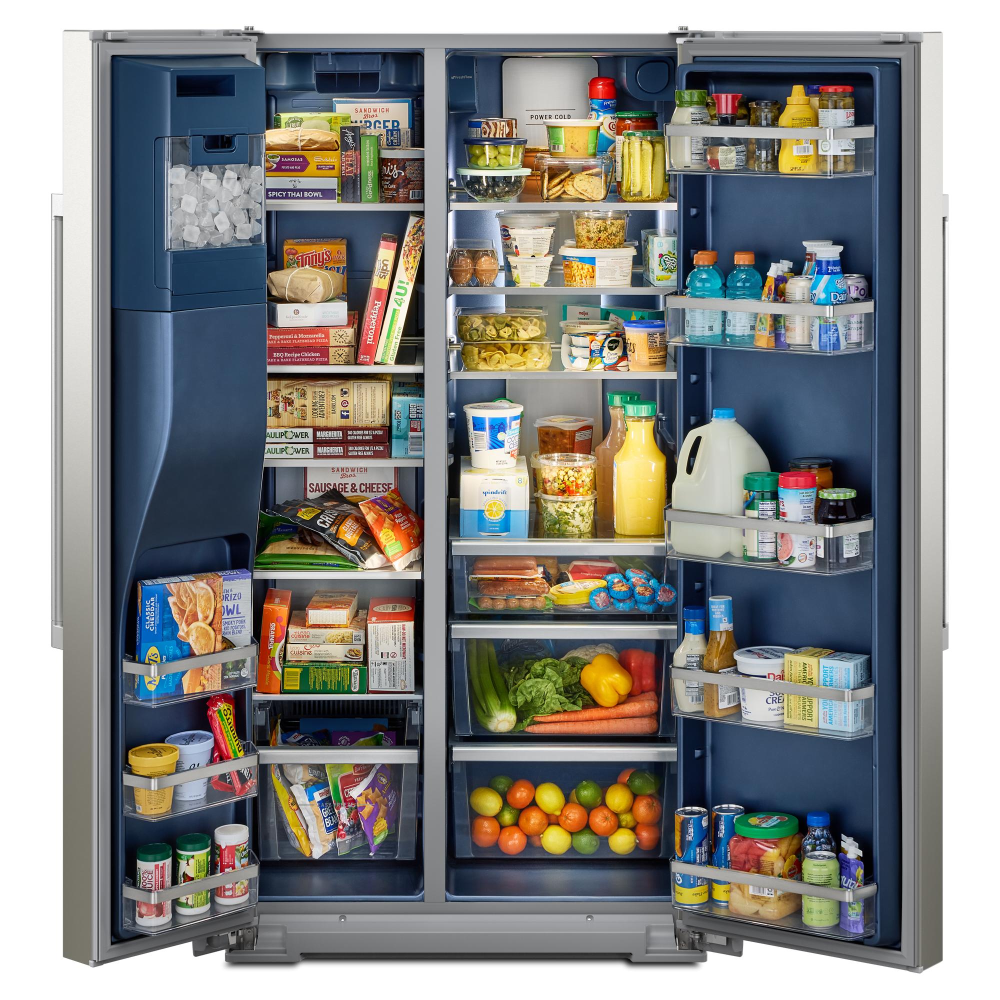This 36-inch XL Capacity side-by-side refrigerator has ultimate cooling performance. The PowerCold® feature takes your groceries from room temp to chilly quickly, and the EvenAir Cooling System keeps everything consistently cold front to back. The LED light tower lets you see corner to corner on every shelf, all against a striking Arctic Blue Interior. All with tons of internal capacity to take on any grocery trip.