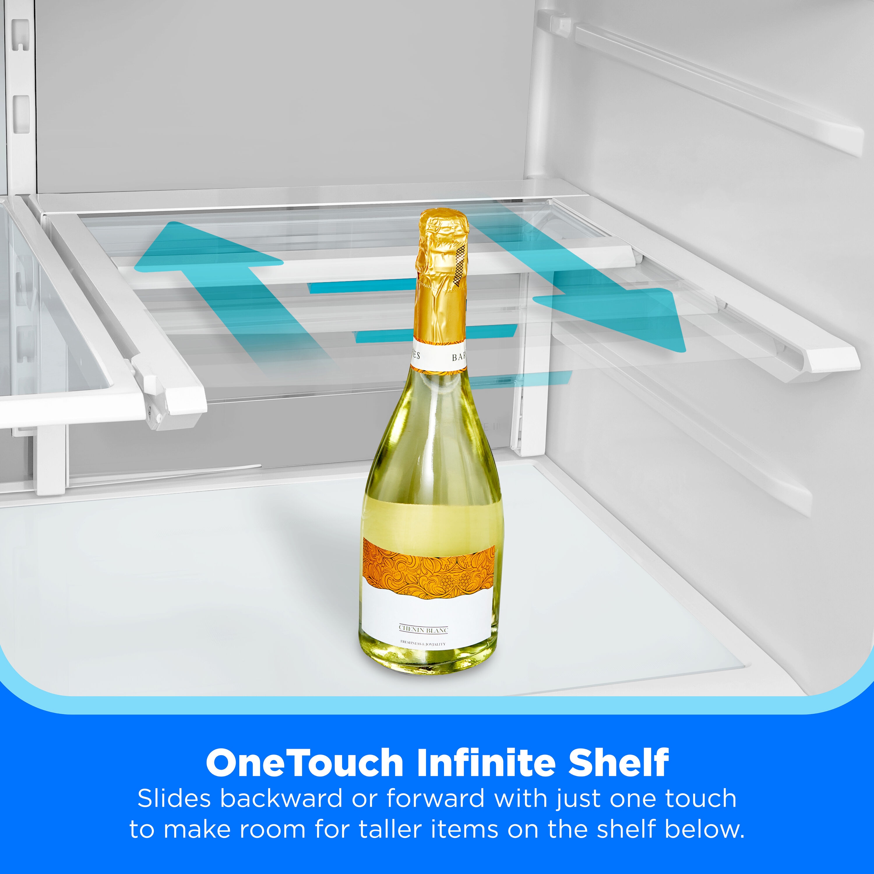 OneTouch Infinite Shelf: Slides backward or forward with just one touch to make room for taller items on the shelf below.