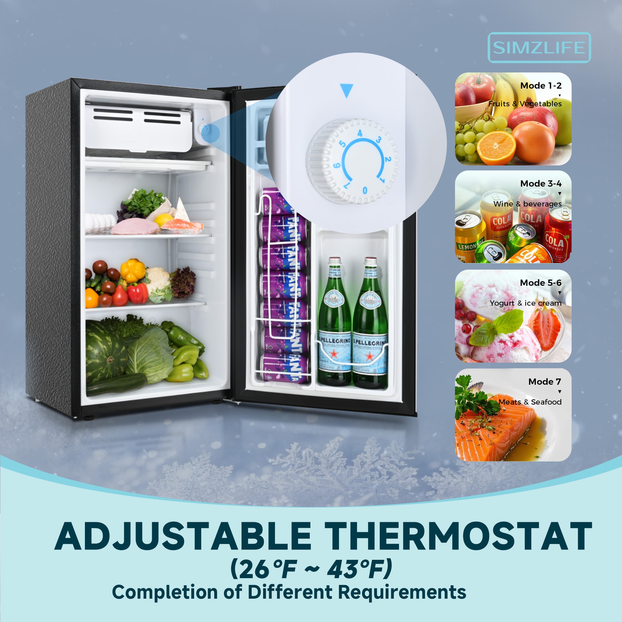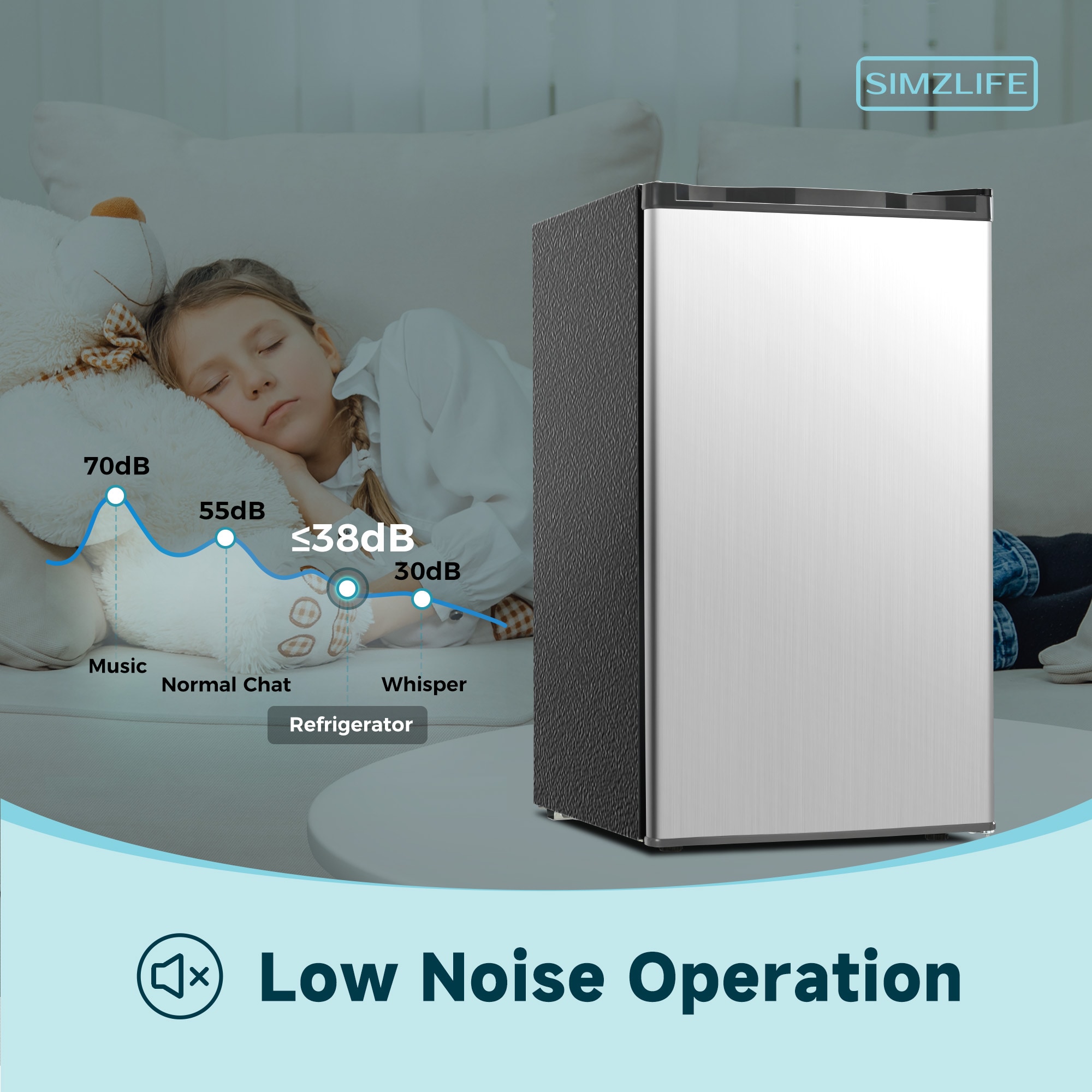 Our mini refrigerator, energy-saving and environmentally friendly, providing you with an efficient cold storage experience. Uniquely user-friendly design with LED light allows you to access it anytime at night with no restrictions. Featuring a large capacity of 3.2 cu. ft. including 2.9 cu. ft. refrigeration section and 0.3 cu. ft. micro-freezing section, it meets your various storage needs. Compact design for bedrooms, kitchens, dormitories and offices with a small footprint of only 2.2 square feet. Quiet operation, only 38dB, five-position temperature control knob, precise temperature adjustment, thoughtful details reflect quality.Our professional after-sales team is at your service 24 hours a day, and the product is fully equipped, so you can enjoy a convenient refrigeration experience.
