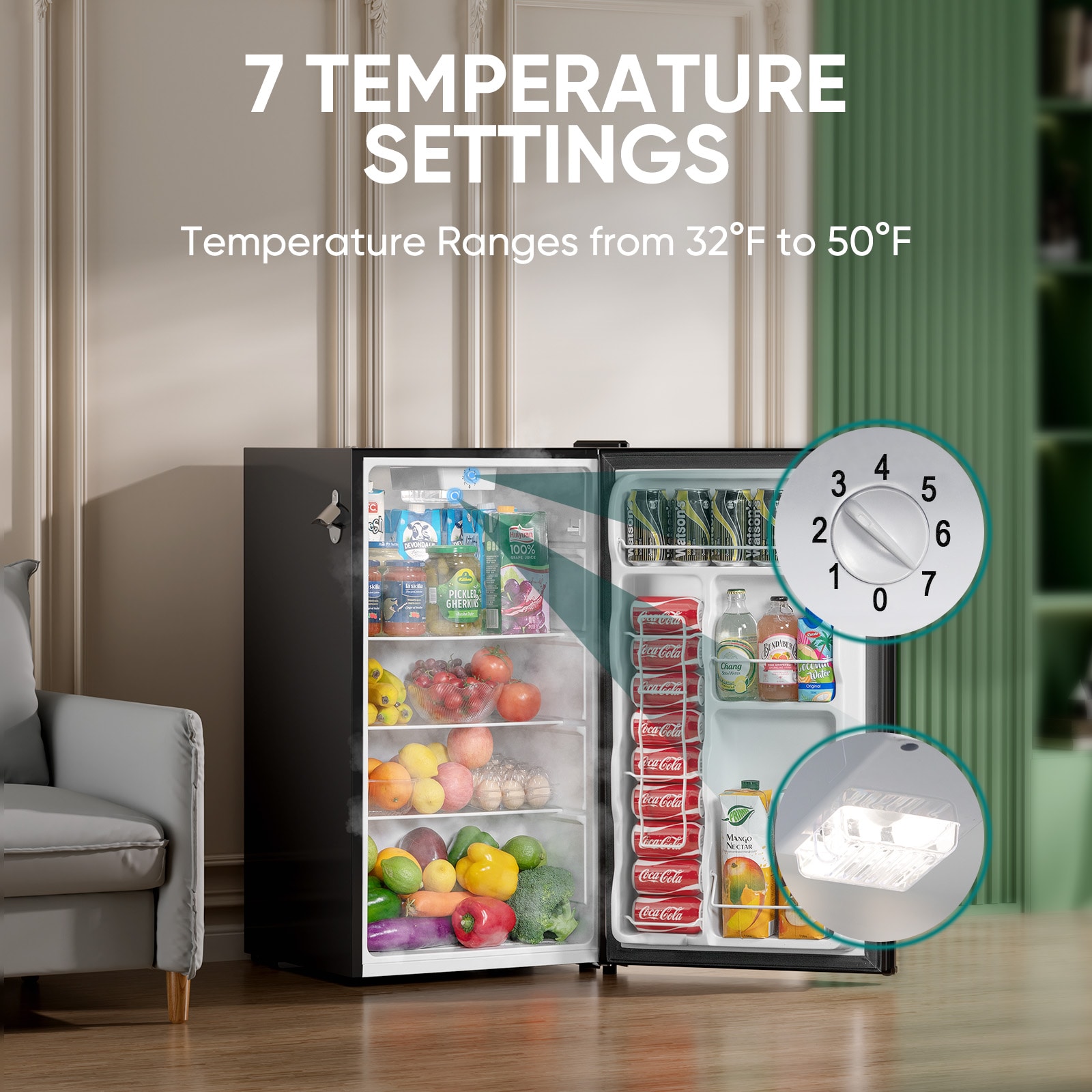 This small refrigerator offers 7 temperature settings to optimize storage for different products.