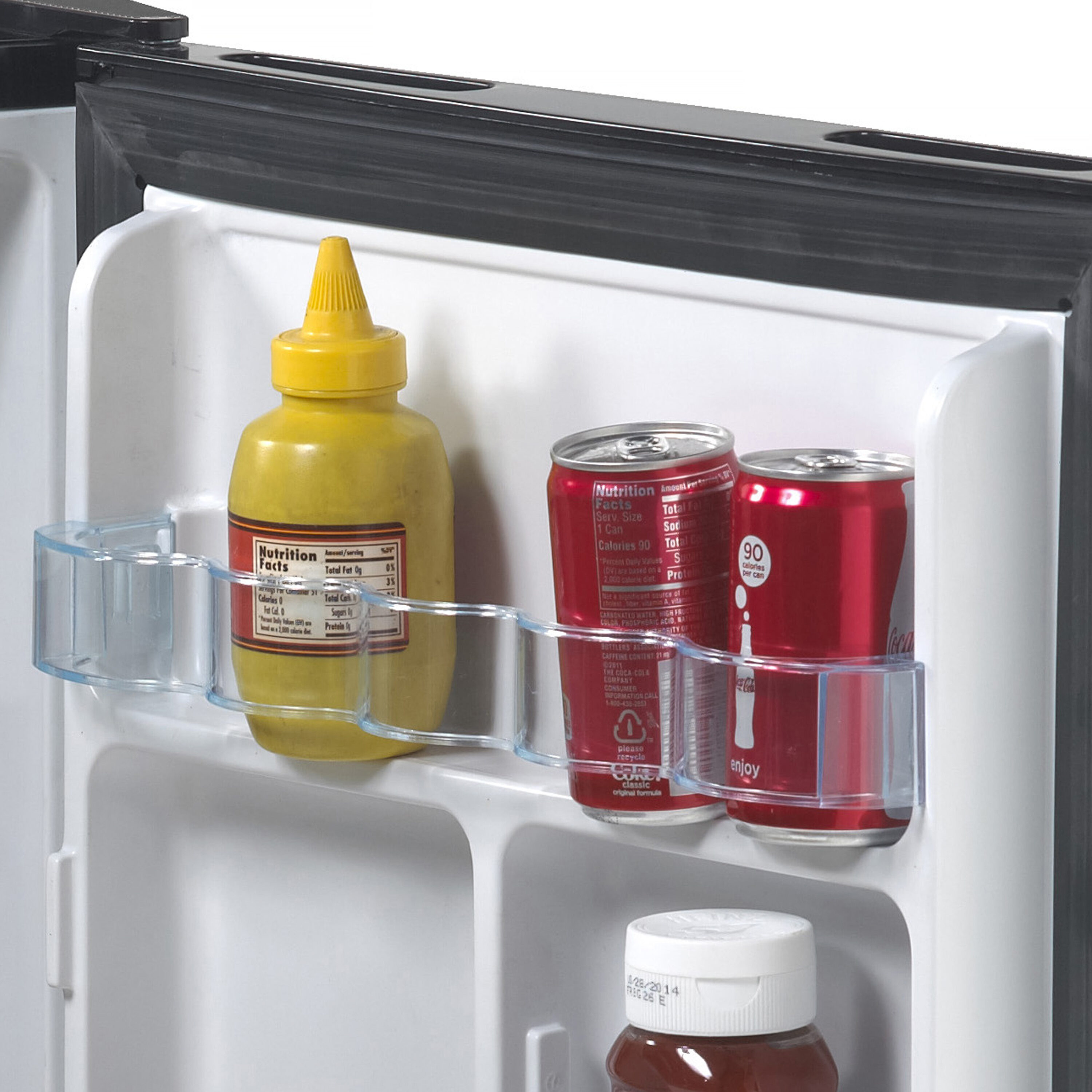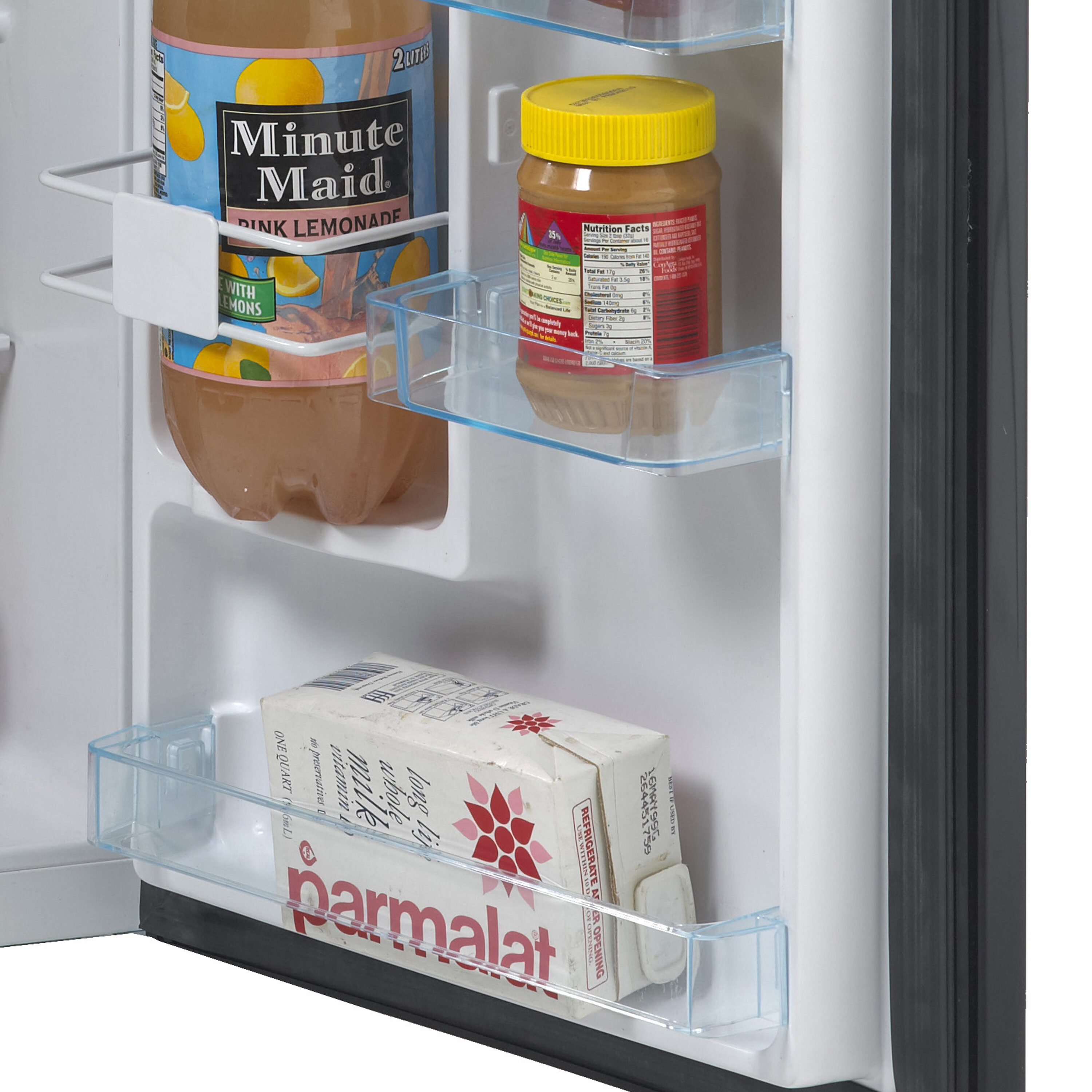 Keep your favorite beverages and snacks close by in the 3.3 cubic foot refrigerator from West Bend. Ideal for anywhere you need a little extra refrigerator space, the compact size makes it the perfect mini fridge for the office, dorm, man cave, she shed, bar, bedroom and more. Stock the mini fridge with bottled water and soda cans or try using it as a dedicated beer cooler or wine fridge. Adjustable door bins can accommodate 2 liter bottles as well as other drinks, condiments and more. Arrange the adjustable glass shelves to store salads, fruits, snacks and other food for easy access throughout the day. This black mini fridge features manual defrost, so your food and beverages remain fresh and cold. Select the right settings for your items with the full range temperature control. With a recessed door handle, flush back design and reversible door, this compact refrigerator is the perfect choice for any small space.