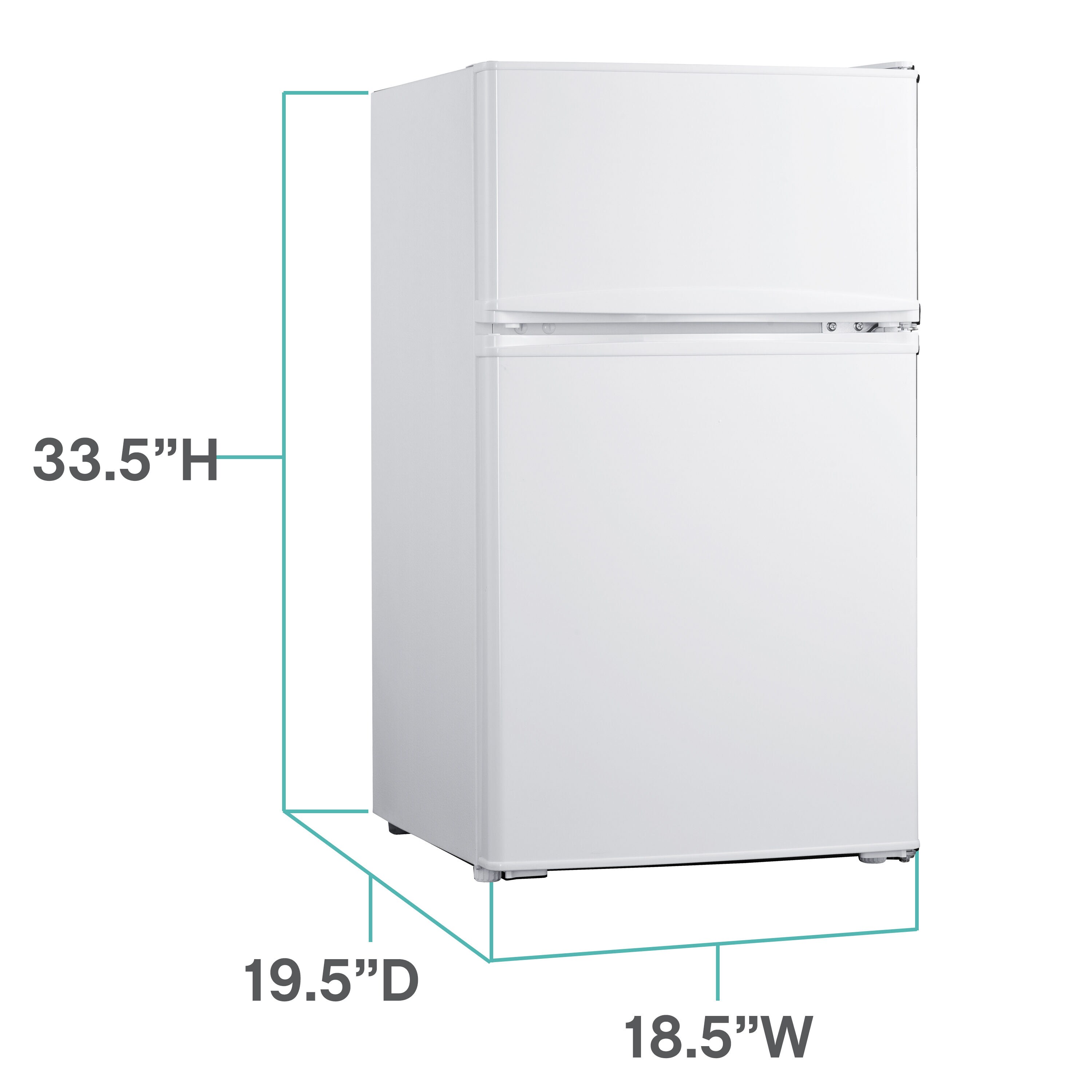 Keep your favorite beverages and snacks close by in the 3.1 cubic foot refrigerator from West Bend. Ideal for anywhere you need a little extra refrigerator and freezer space, the compact size makes it the perfect mini fridge with freezer for the office, dorm, man cave, she shed, bar, bedroom and more. Stock the 2.1 cubic foot mini fridge with bottled water and soda cans or try using it as a dedicated beer cooler or wine fridge. The built in door shelves can accommodate a 2 liter bottle and six 12 ounce cans, as well as other drinks, condiments and more. Arrange the adjustable glass shelves to store salads, fruits, snacks and other food for easy access throughout the day. The 1.0 cubic foot freezer is perfect for stocking up on pizza, ice cream and other frozen foods. This white mini fridge features automatic defrost, so your food and beverages remain fresh and cold. Select the right settings for your items with the full range temperature control. With a recessed door handle, flush back design and reversible door, this compact refrigerator is the perfect choice for any small space.