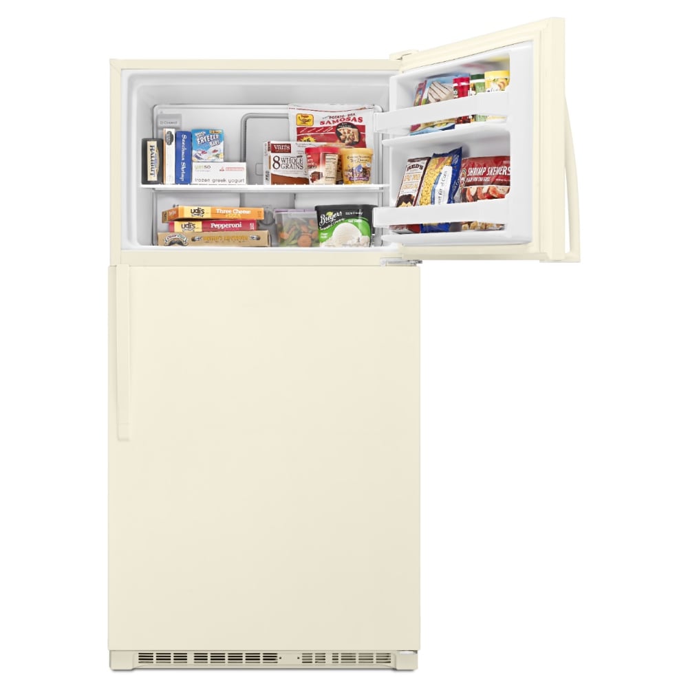 Do you like your freezer at eye level? This classic Whirlpool 20 cu top-freezer refrigerator is sized to fit the fresh foods, beverages, and frozen items your family loves. Purposeful storage features like a separate dairy bin and side bin that flexes to accommodate larger items simplify the task of figuring out where to put your groceries.