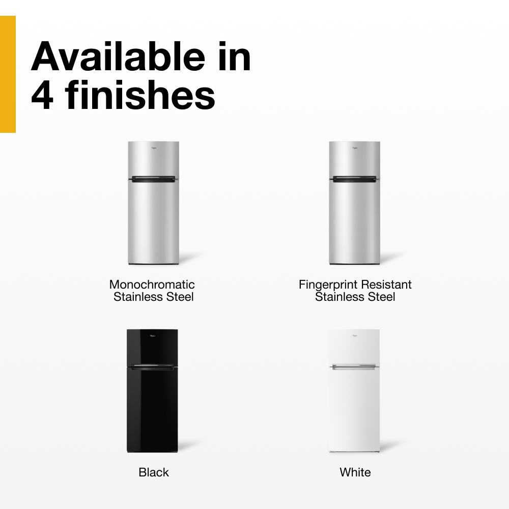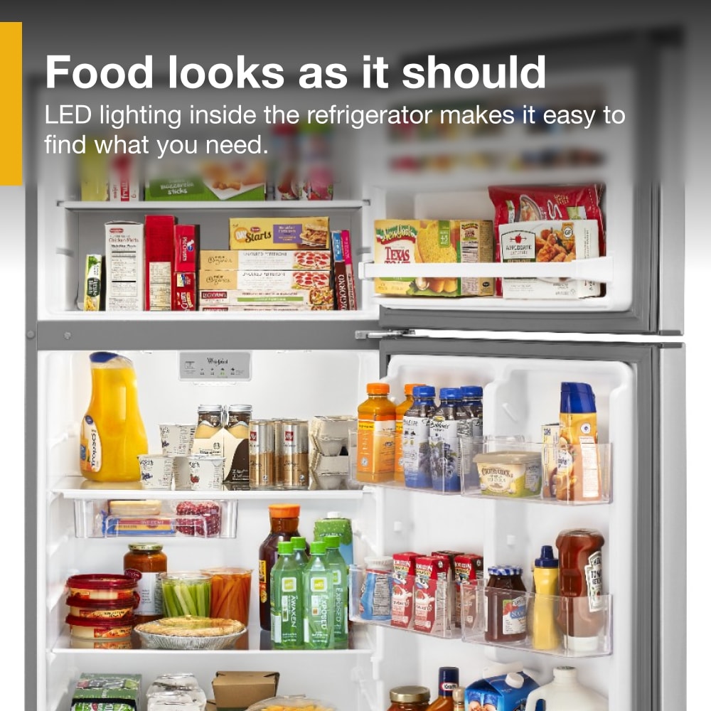 Sleek design, purposeful features. This Whirlpool® 18 cu ft top-freezer refrigerator has a pocket handle that gives it a seamless appearance. The thoughtful design extends to the interior as well, with a family-friendly capacity and storage features like a Flexi Slide-Bin™ that moves to accommodate larger items, and side door bins that make it easy to store (and find) beverages and condiments.