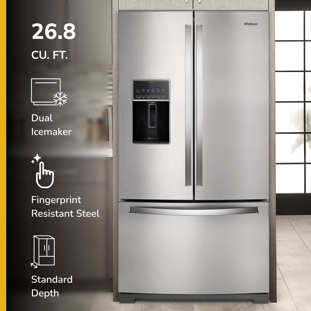 More room for your most loved foods, beverages, and double the ice-making capacity. This family-friendly 26.8 cu ft French Door refrigerator from Whirlpool® has dual ice makers and is thoughtfully designed with purposeful storage features to make things easy to fit and find. ENERGY STAR certified.